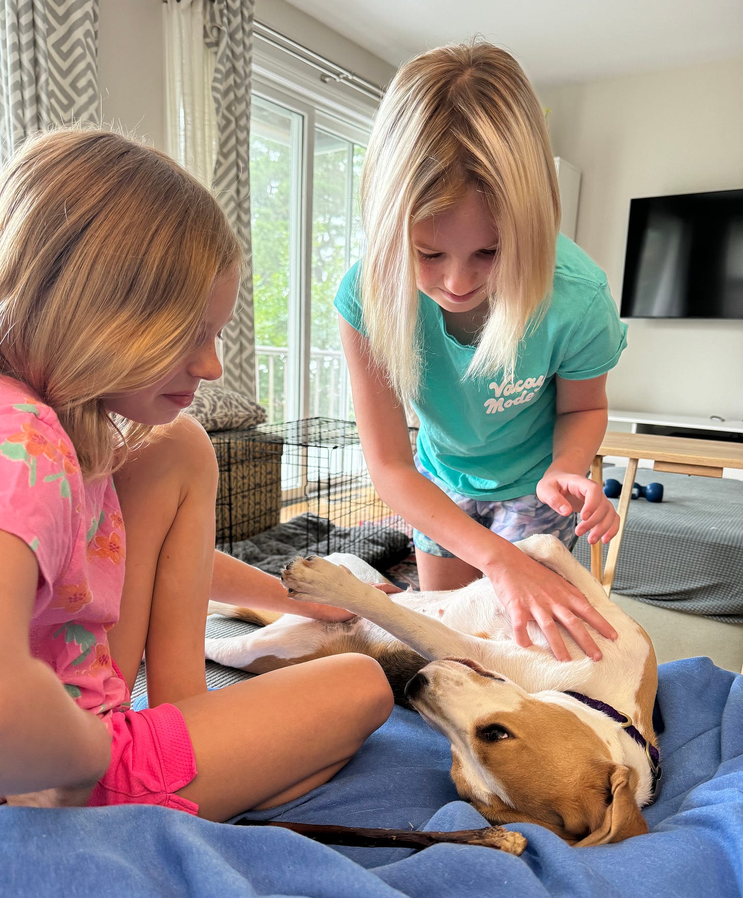 The cherished friends come with cherished, horrifyingly brilliant and disgusting children who leap and thump and collect mud and bugs and sea creatures and, apparently, noise from everywhere in the environment. The beagle was cowering for the first hour or so, and then quickly realized the potential of these co-conspirators. They, too, think that revolting thing half-buried in the dirt and sand is worth digging up. They run laps with her on the deck, screaming and squealing and kicking her food ball as she tries to keep up. She comes in literally huffing and panting, perches on the couch for a few minutes gasping for air and looks at me—why have you not told me about this before—and then leaps off to go continue the game. She sits on the ottoman staring at them intently, as they sit across from her on the couch and share their candy from what must be fifty-pound bags of it, purchased from the sweets store in Provincetown. She’ll take her piece and crunch or chew it politely, hardly ever trying to hurl herself into the bag for another share.