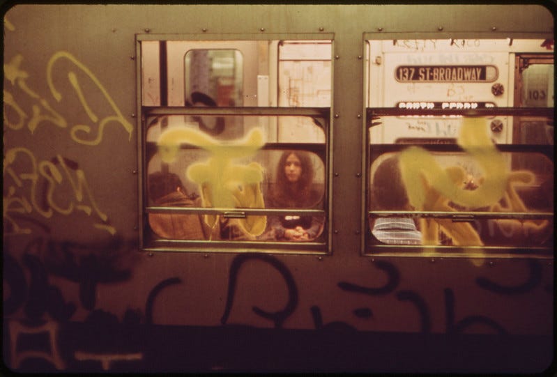 Awake was important. The subway in 1970s Manhattan was not a place where you could safely nod off. Or sit back. You for sure didn’t want to lean your head against the wall behind you. At best, your hair might stick to still-wet spray paint; at worst, to some unidentified bodily fluids left behind earlier that day. Or month. Or year.