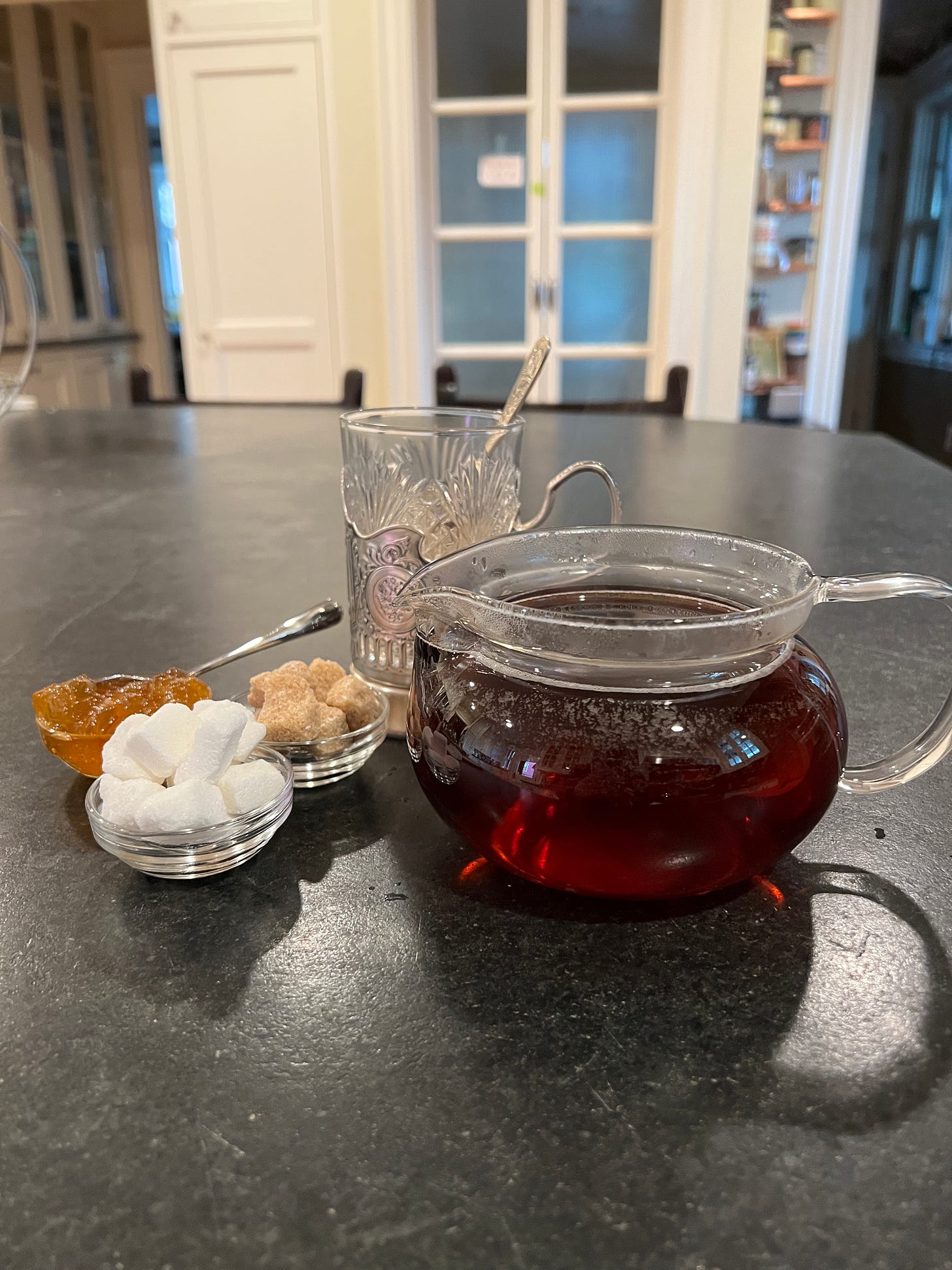 Reminds me of my Bubbie, who held a sugar cube in her teeth, or some jam in her mouth, and drank her Orange Pekoe from her tea "gless". She didn't have a fancy, noisy setup like you. We got her special "gless" cups.