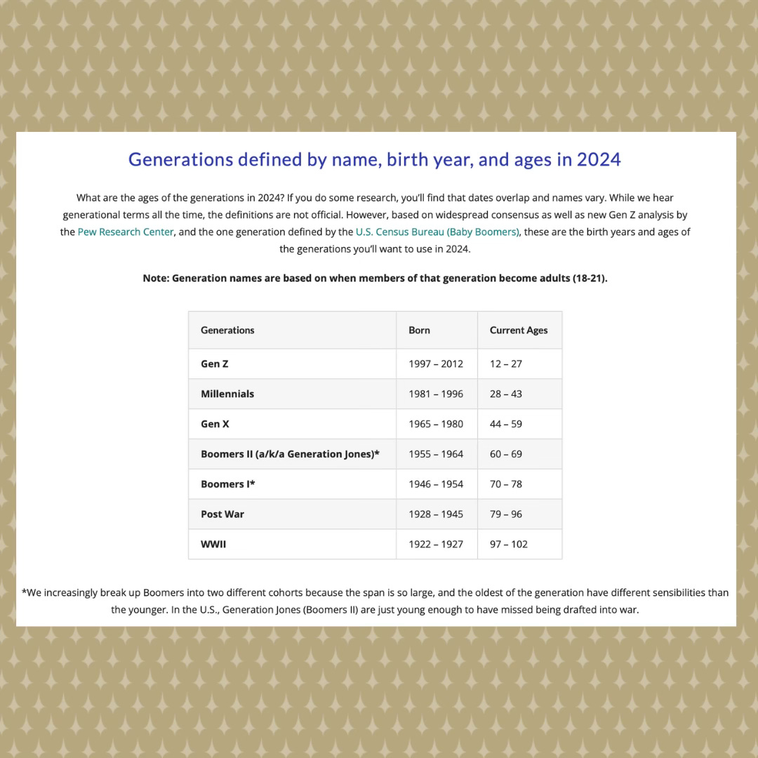 And often I wonder if there have been studies on the confirmation bias of generational therapists and patients. Since Millennials/Gen Xers (or whichever gen is talking) are assuming Boomers don’t go to therapy—a fact not in evidence, but whatever—and assuming Millennials/Gen Xers do, are they only seeing therapist their own age? The sweeping generalizations about what Boomers “are like” are bizarre. So are the sweeping generalizations about what all the other generations are like, but people die on the hill of Boomer flaws and negative characteristics.