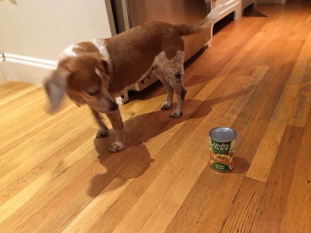 The kitchen is a busy place, and sometimes things fall from counters and plates. How, one wonders, might one teach a beagle not to lunge for things dropped in the course of meal preparation? Not only is it rude, especially when others don't realize your occasional resource guarding is largely nonsense, backed up only by your seven remaining teeth and mighty attitude, but it can cause injury if, as recently occurred, said beagle does a snatch-and-grab on a piece of very hot chicken fallen out of a pan.